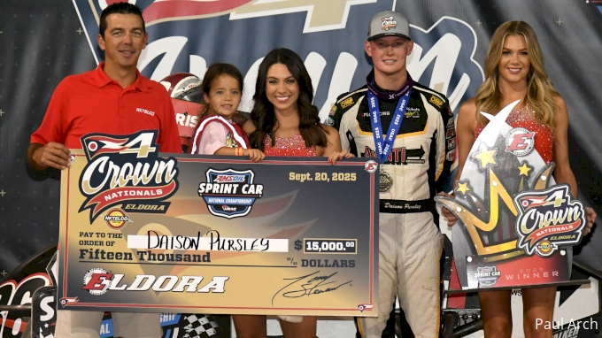 Posing for photos ops in Eldora Speedway victory lane, Daison Pursley celebrates his second of four 4-Crown wins. (Paul Arch)