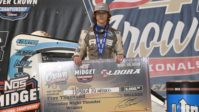 In his 101st series feature start, the 21-year-old Hayden Reinbold picked up his first career USAC National Midget feature victory in Thursday's $5,000-to-win prelim. It didn't come without dramatics as Reinbold ran out of fuel crossing the finish-line by 0.336 seconds over Kevin Thomas Jr.